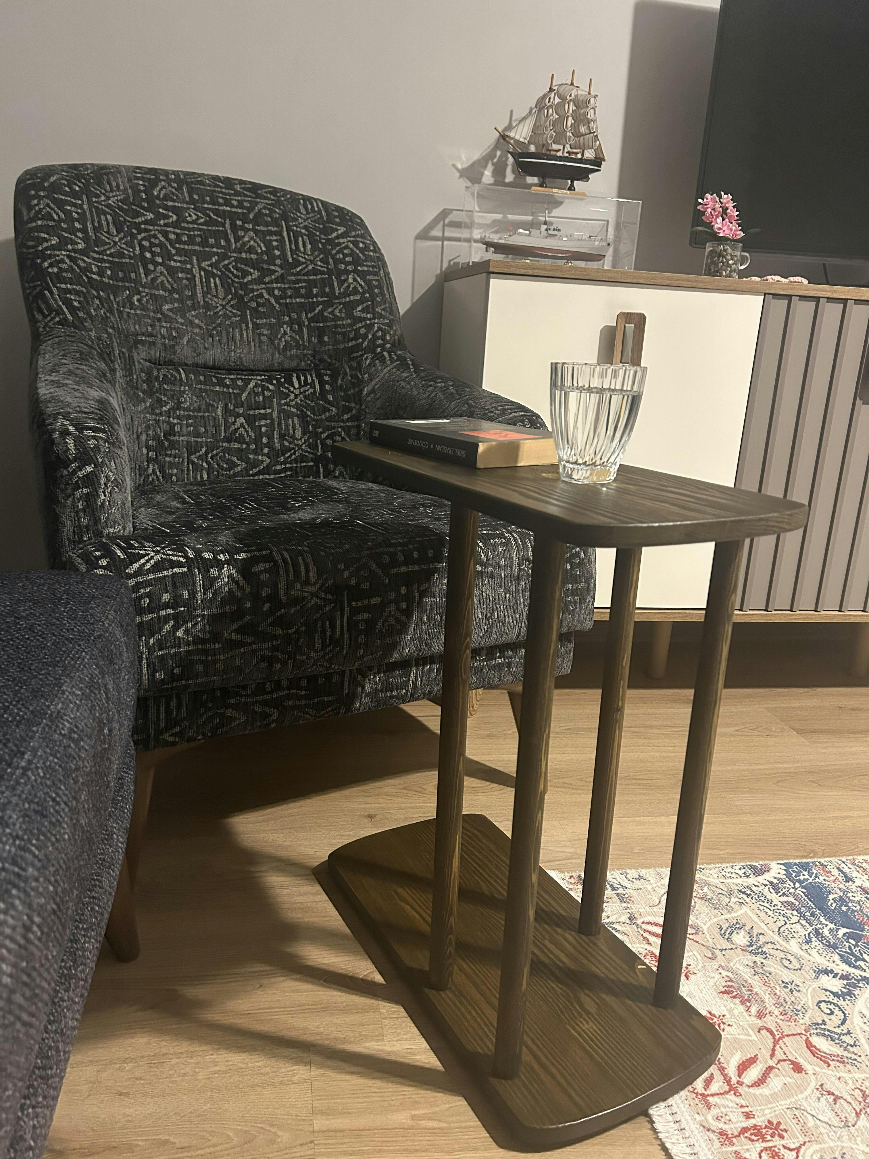 C şeklindeki özel tasarımı sayesinde koltuğun kenarına rahatça yaklaşır; kahve, kitap ya da bilgisayarınızı yerleştirmek için mükemmel bir yüzey sunar. Aynı zamanda yan sehpa, laptop masası veya yatak kenarı rafı olarak da kullanılabilir.